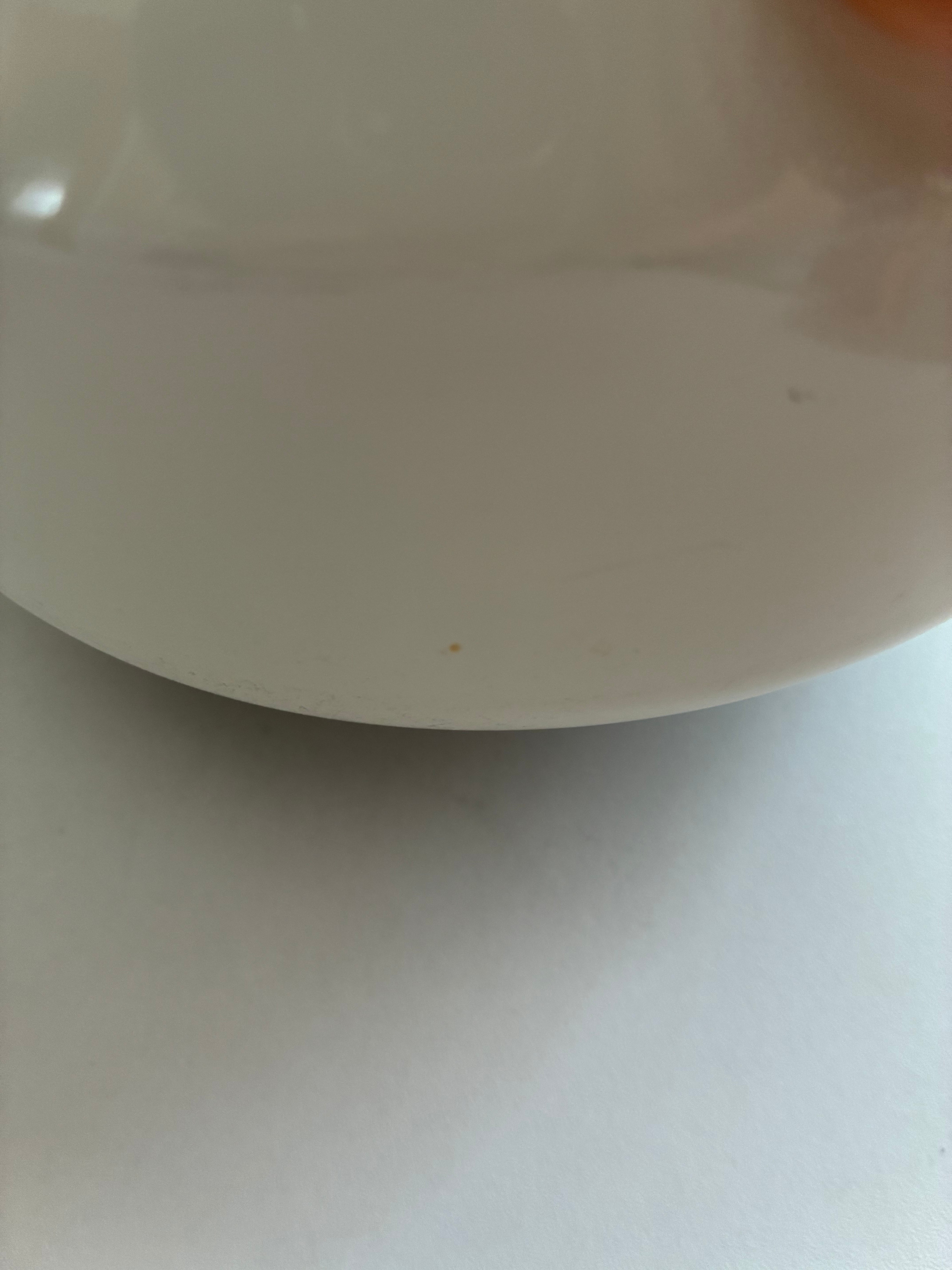 蓋の内側にうっすらと茶色い入りのようなものがあります。本体の外側に1箇所小さな茶色い汚れがあります。製造時に蓋の方にエナメルが多く載ったのか色が少し濃いように見えます。