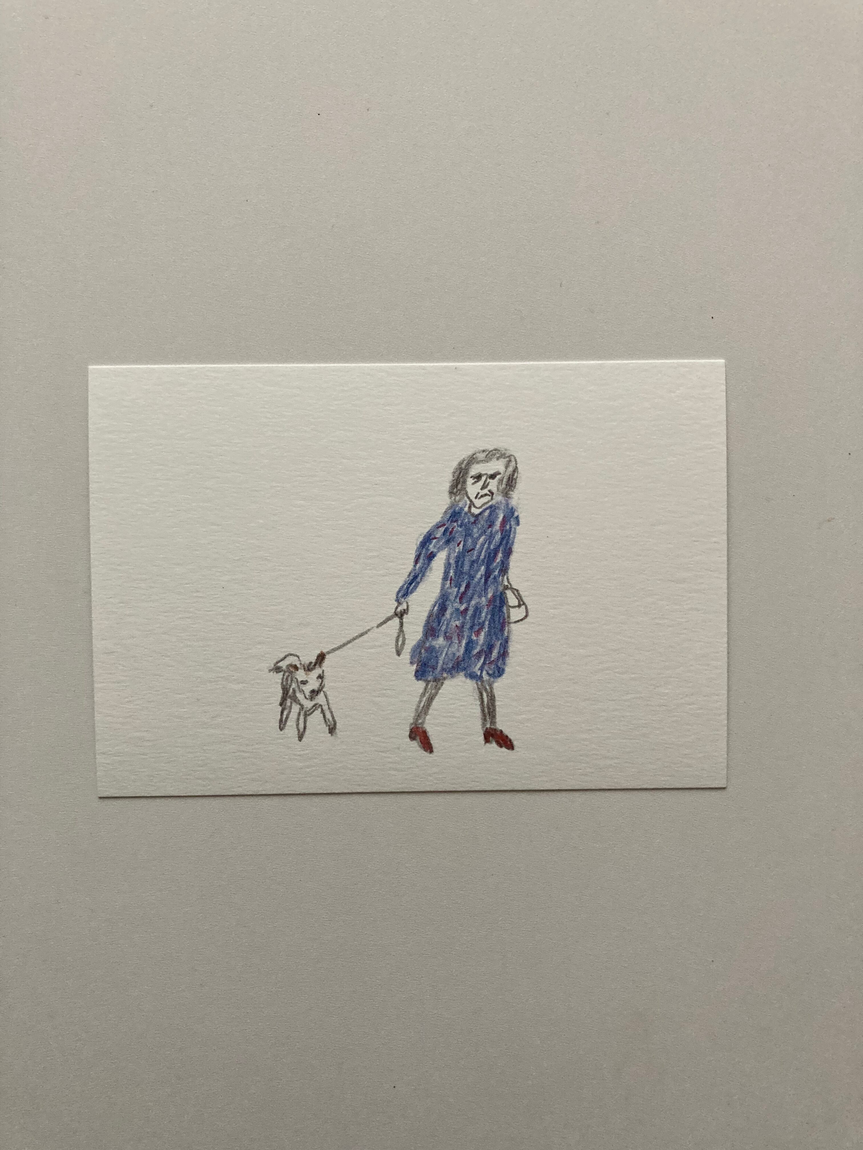 「ロメールの映画にちょっとだけ登場する公園で犬の散歩をするおばあちゃんを描いてみました。お気に入りの一枚です。」