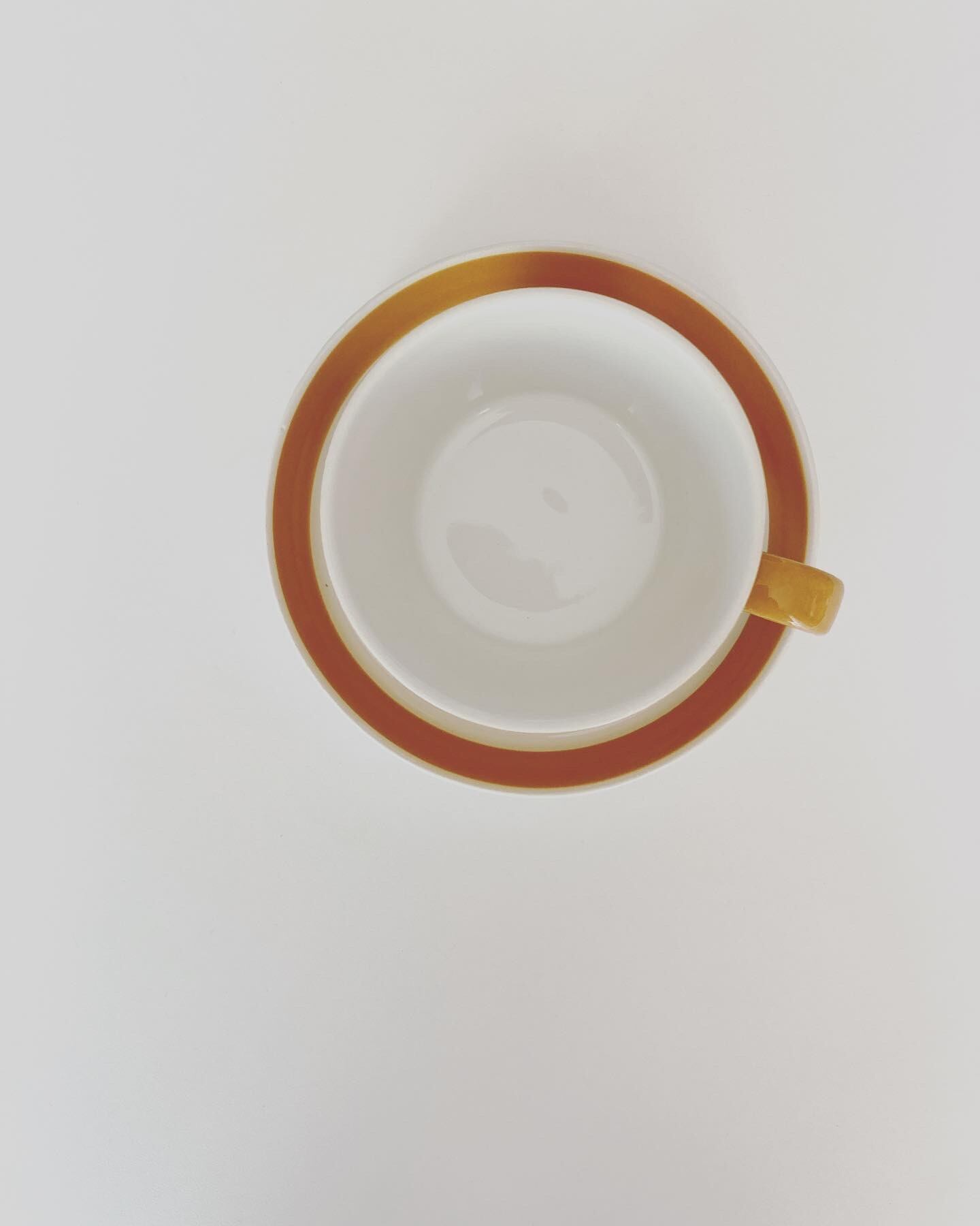 ARABIAで1964年-1974年の間に生産されていた aprikoosiアプリクーシ のカップアンドソーサーです。当時、ARABIAでデザインディレクターだったカイ・フランクの元でデザイナーをしていた、カーリナ・アホによるデザイン。すっきりしたミニマムなフォルムやきれいなアプリコットカラーの色合いがとても魅力的です。