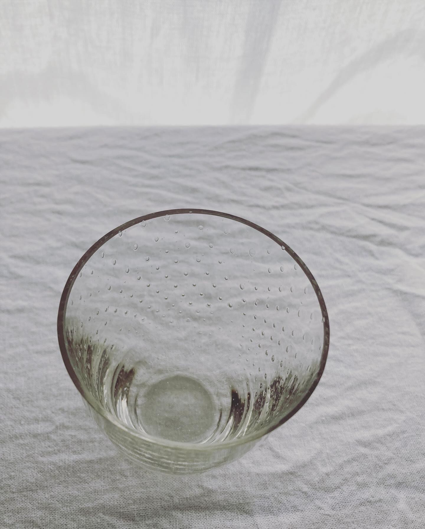 大きすぎず小さすぎず手に収まりがよく、冷たいお茶からビールやワインにもよさそうなグラスです。本当の透明よりはすこしグリーンが入っているようにも見えます。
