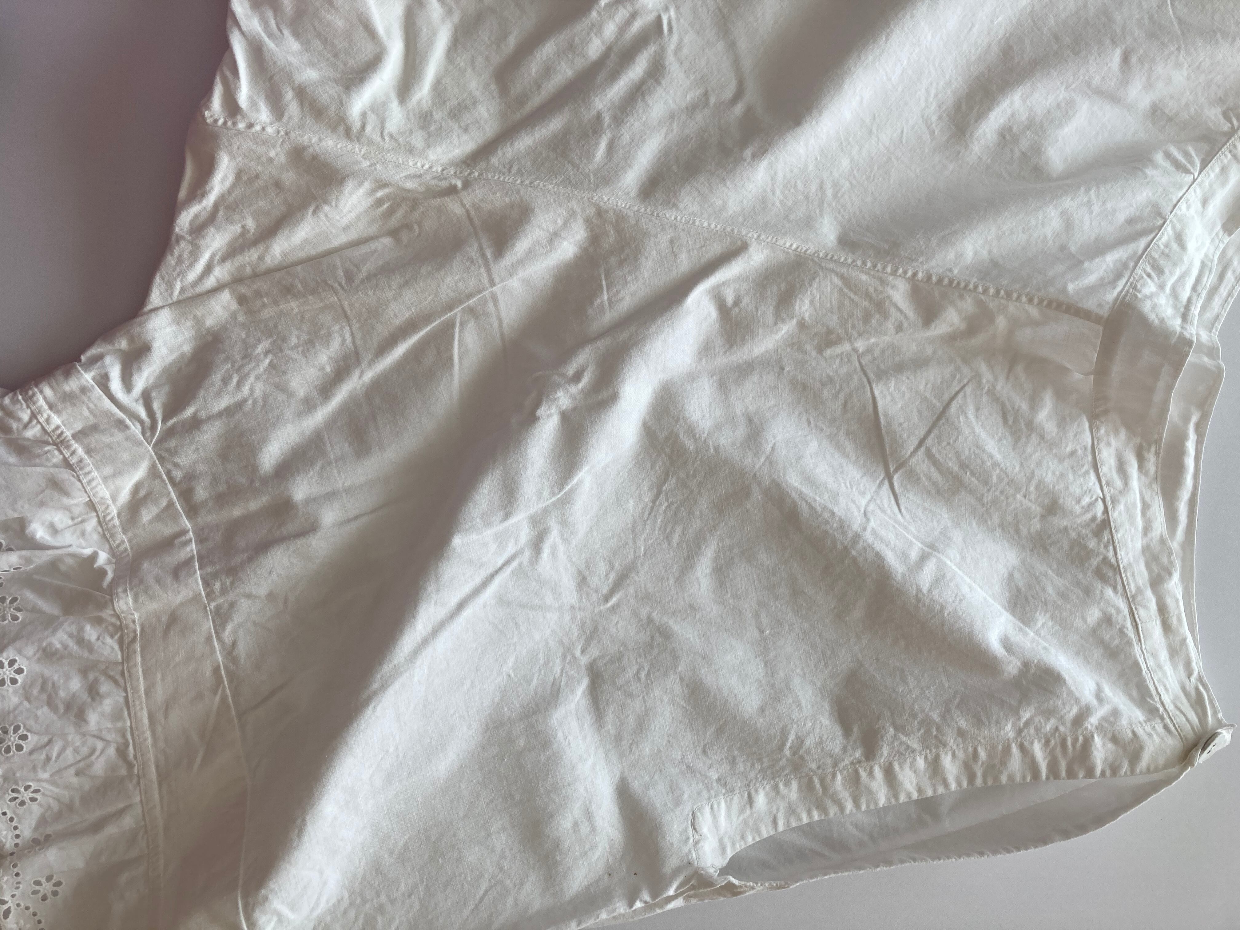 ウエストに2の反対のような文字の刺繍があります。ボタンがウエスト左右に付いていてかわいいつくりになっています。ボタンのしたは開いているのでタイツやレギンスなどをはいていただく工夫は必要になるかと思います。左側に小さなほつれと小さな茶色の染みがございます。(写真5枚目)