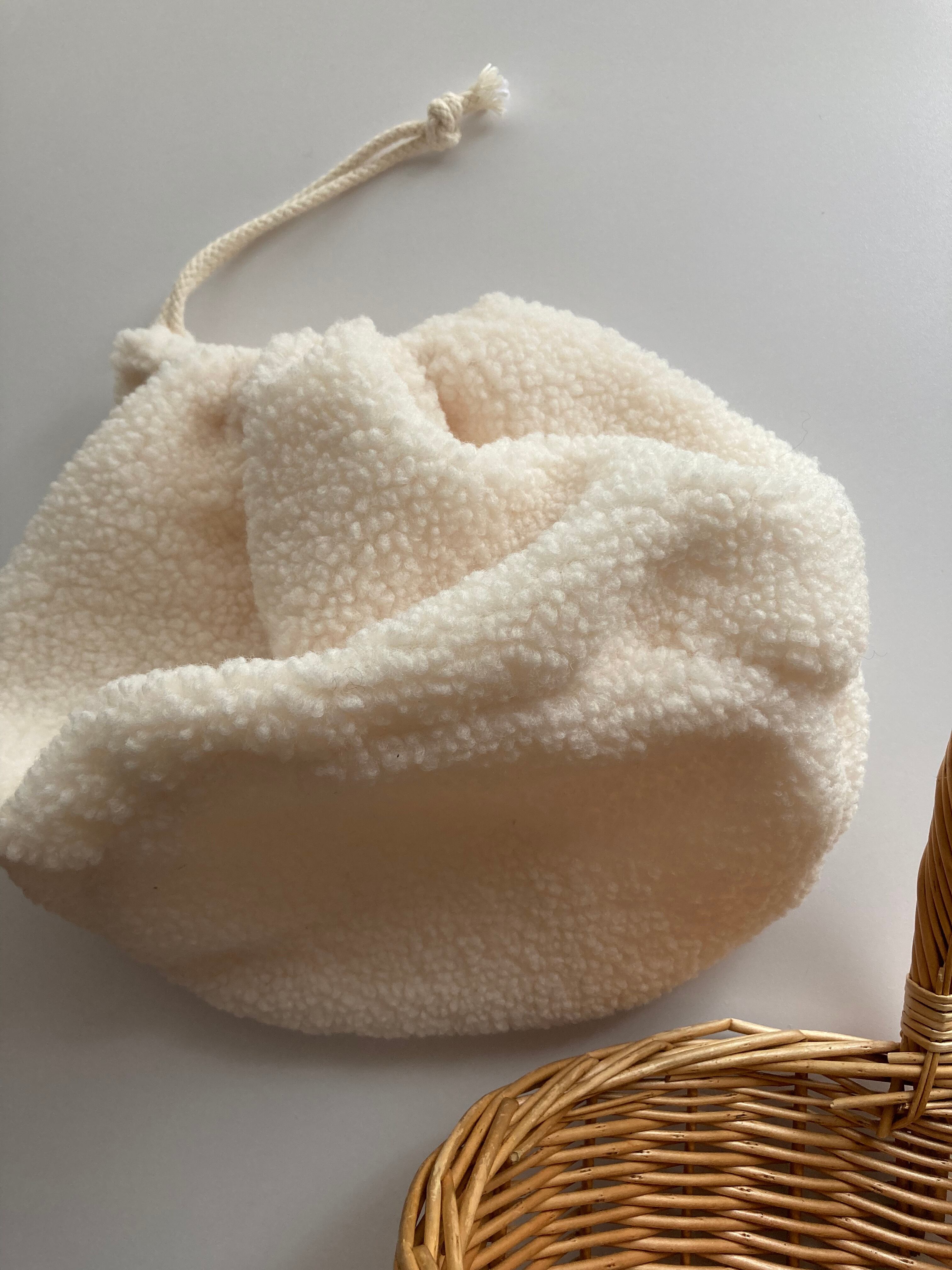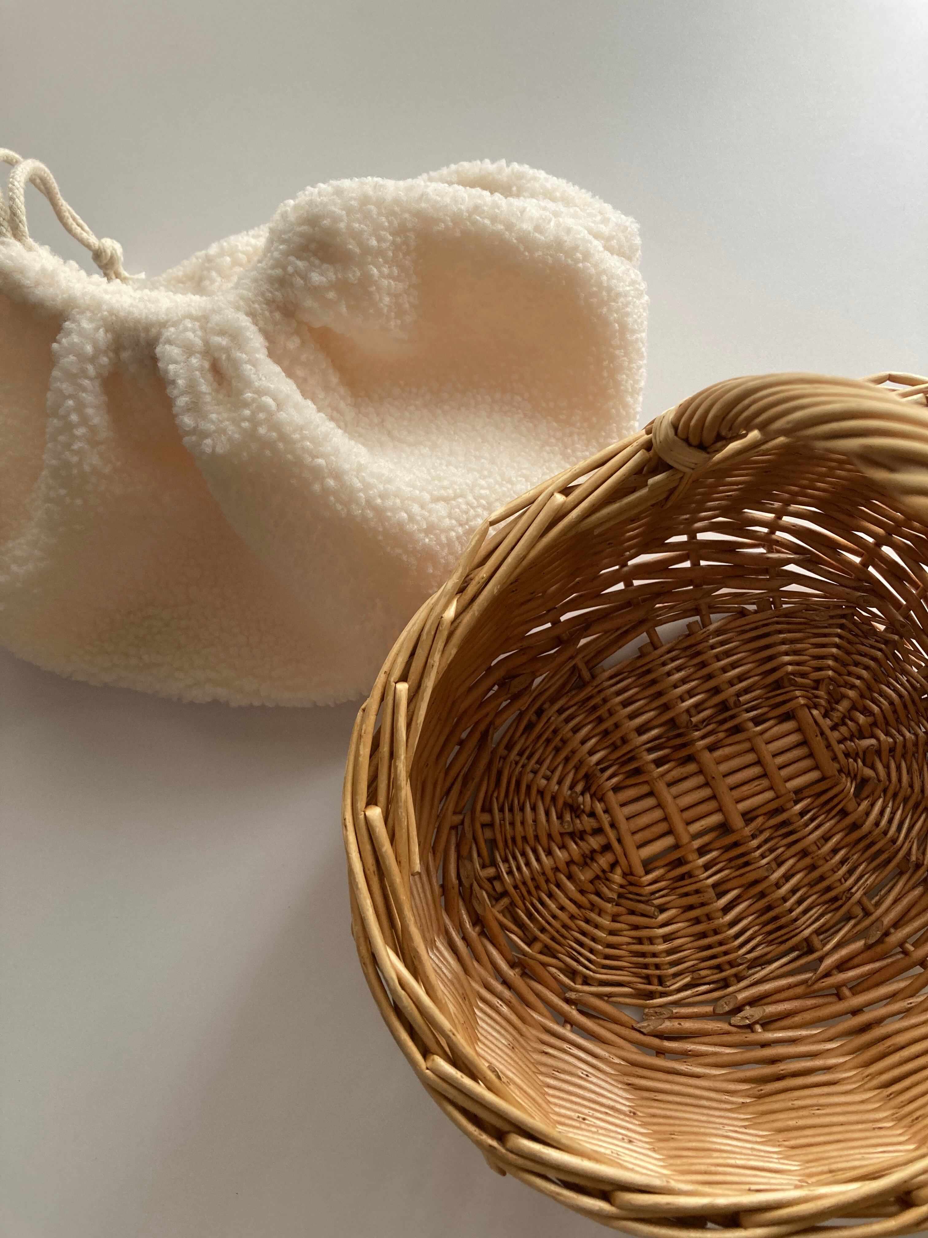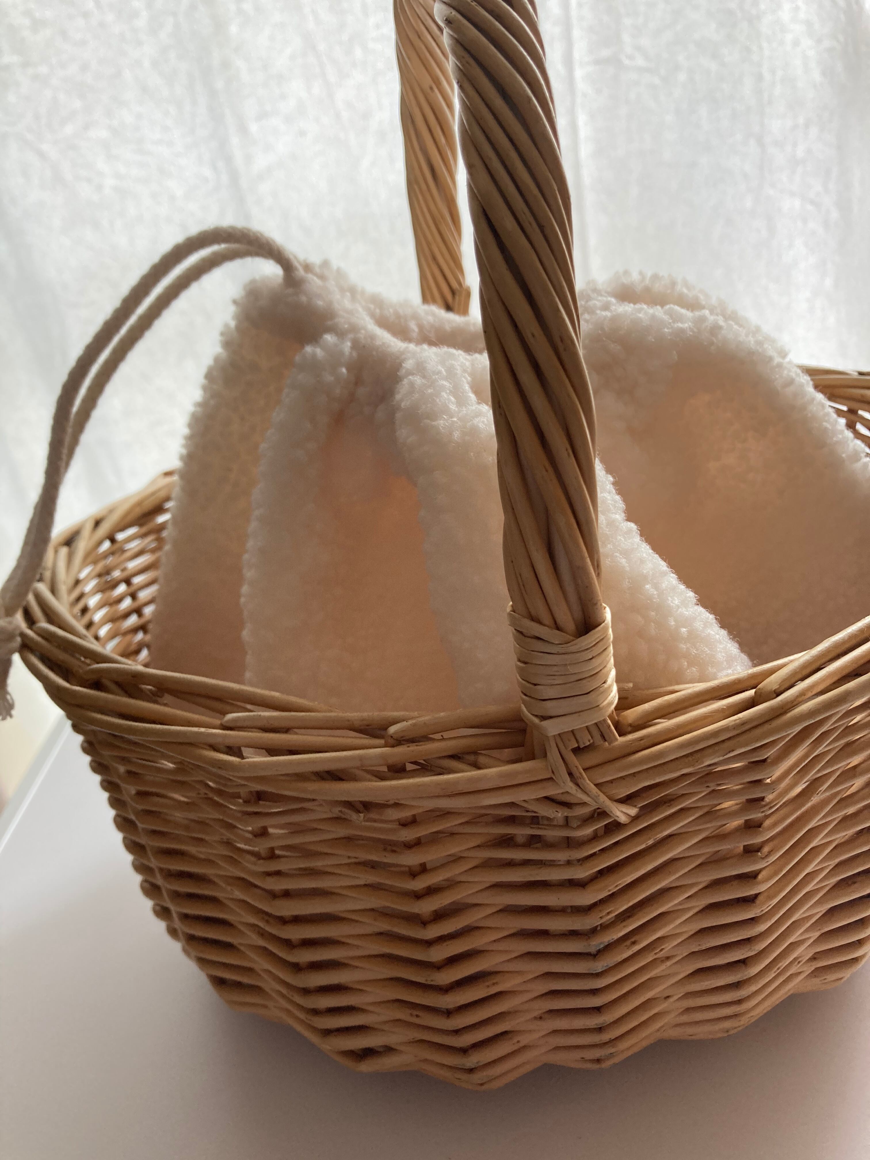 寒くなってきたのでモコモコの白い布でバスケットの大きさに合わせた紐付きの巾着袋をお付けします。この袋は私の手縫いです。底もちゃんと楕円形になっています。紐はフィンランドで買い付けの合間に手芸店で買ってきたものです。