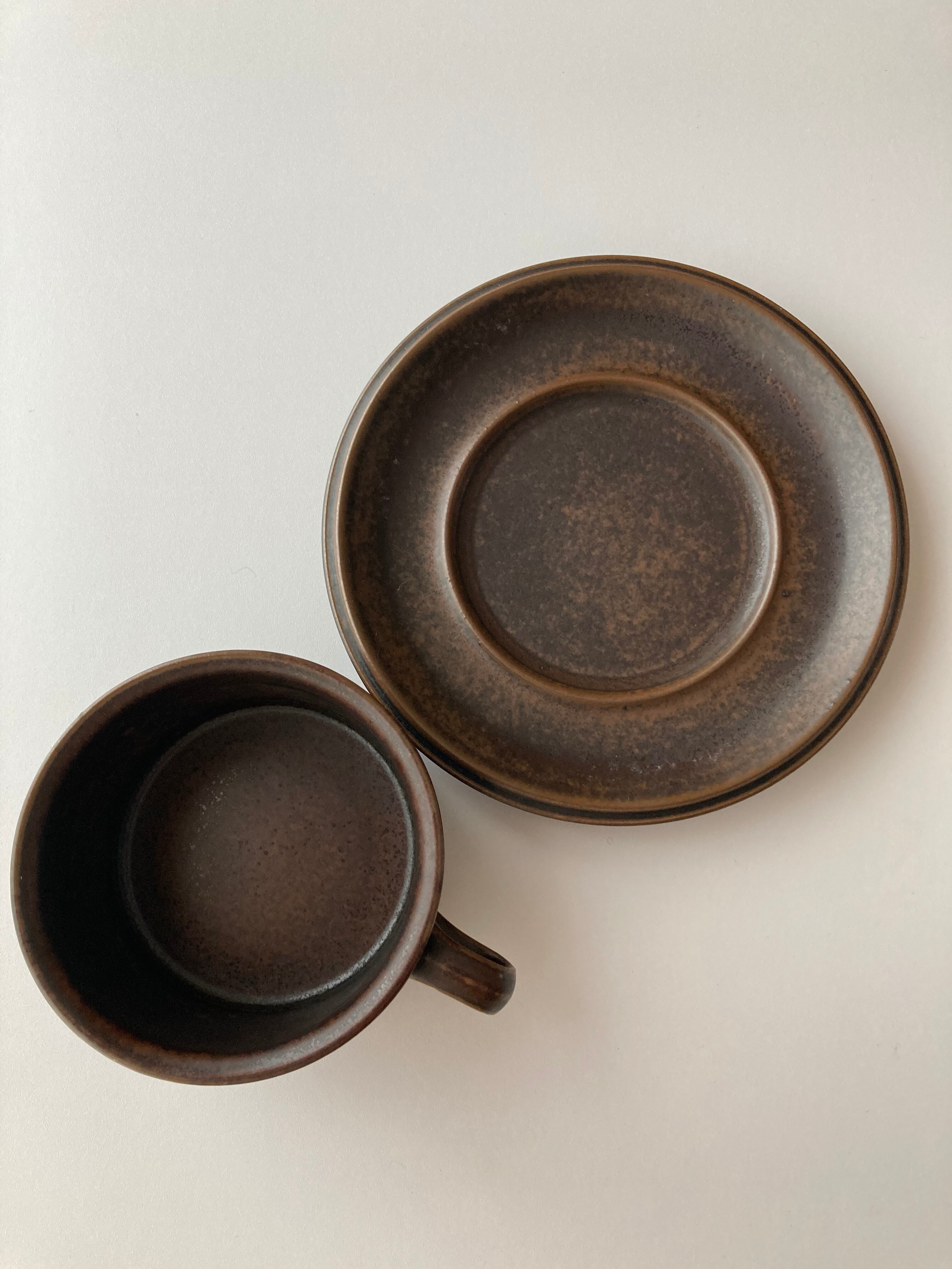 1961〜1999年製造販売。デザインしたのは数々の名作を生み出した、Ulla Procope(ウラプロコッペ)。その名前にふさわしく色づく紅葉のように深いブラウンの釉薬が特徴です。ひとつひとつ色の出方が違います。