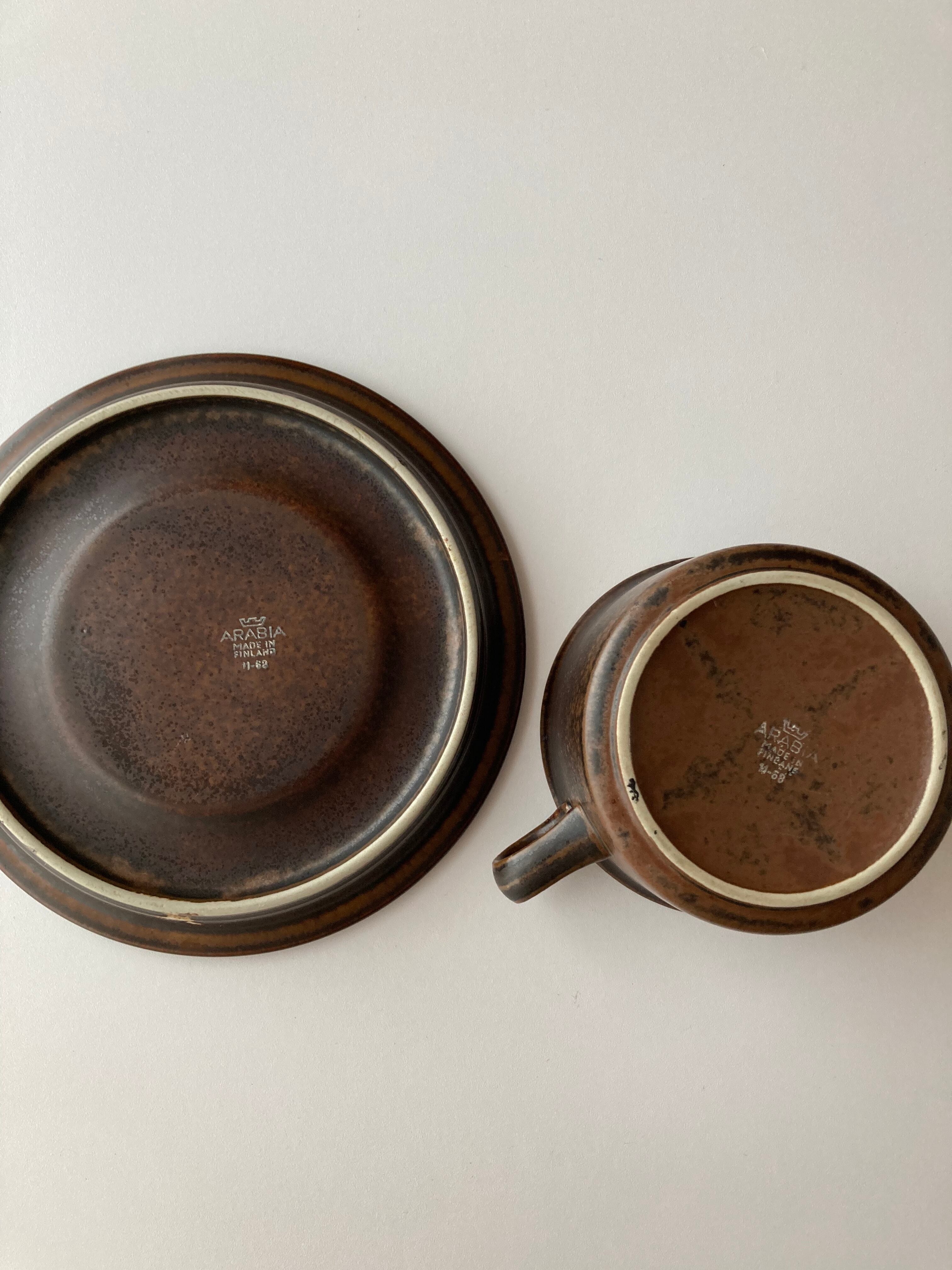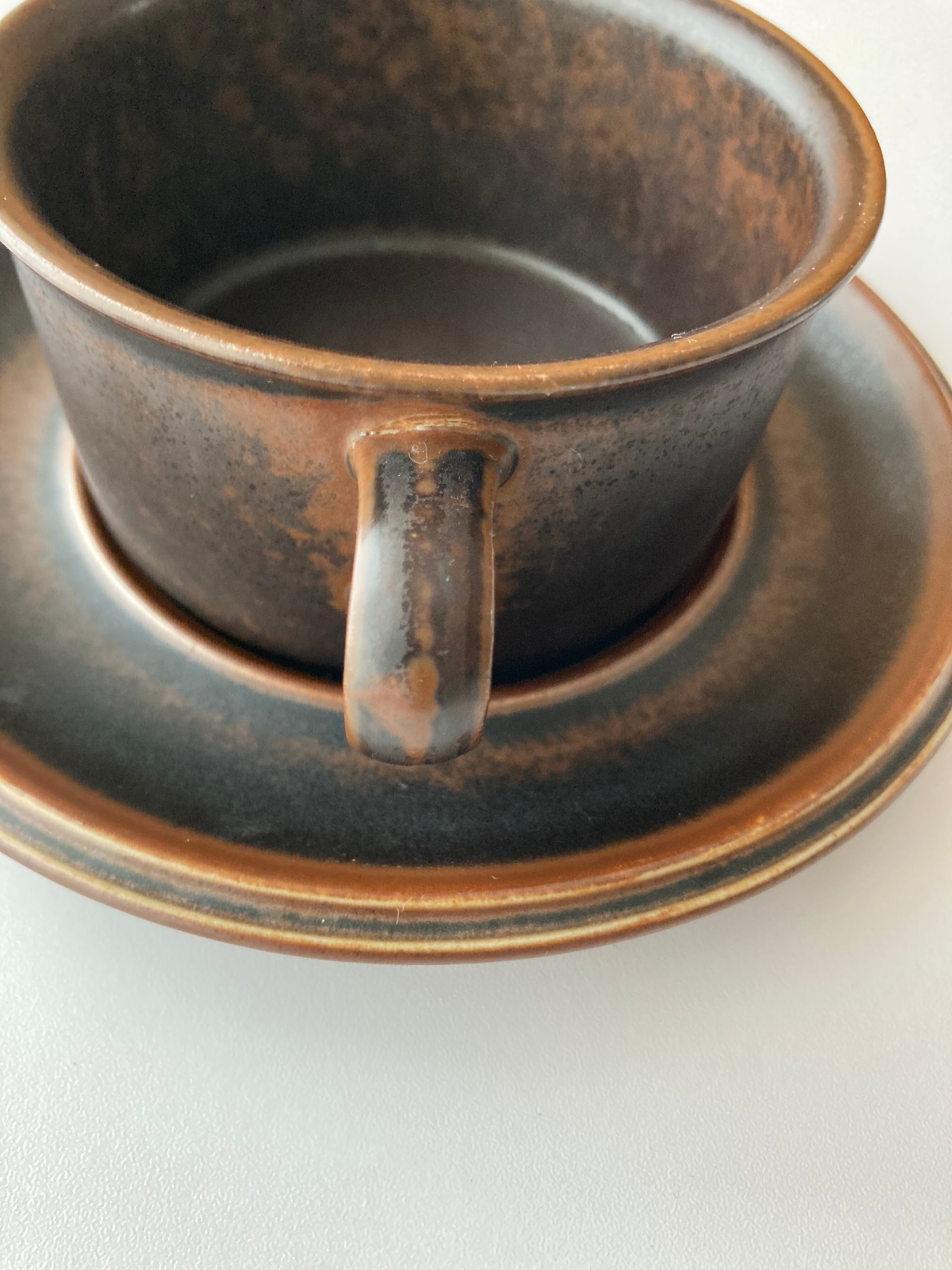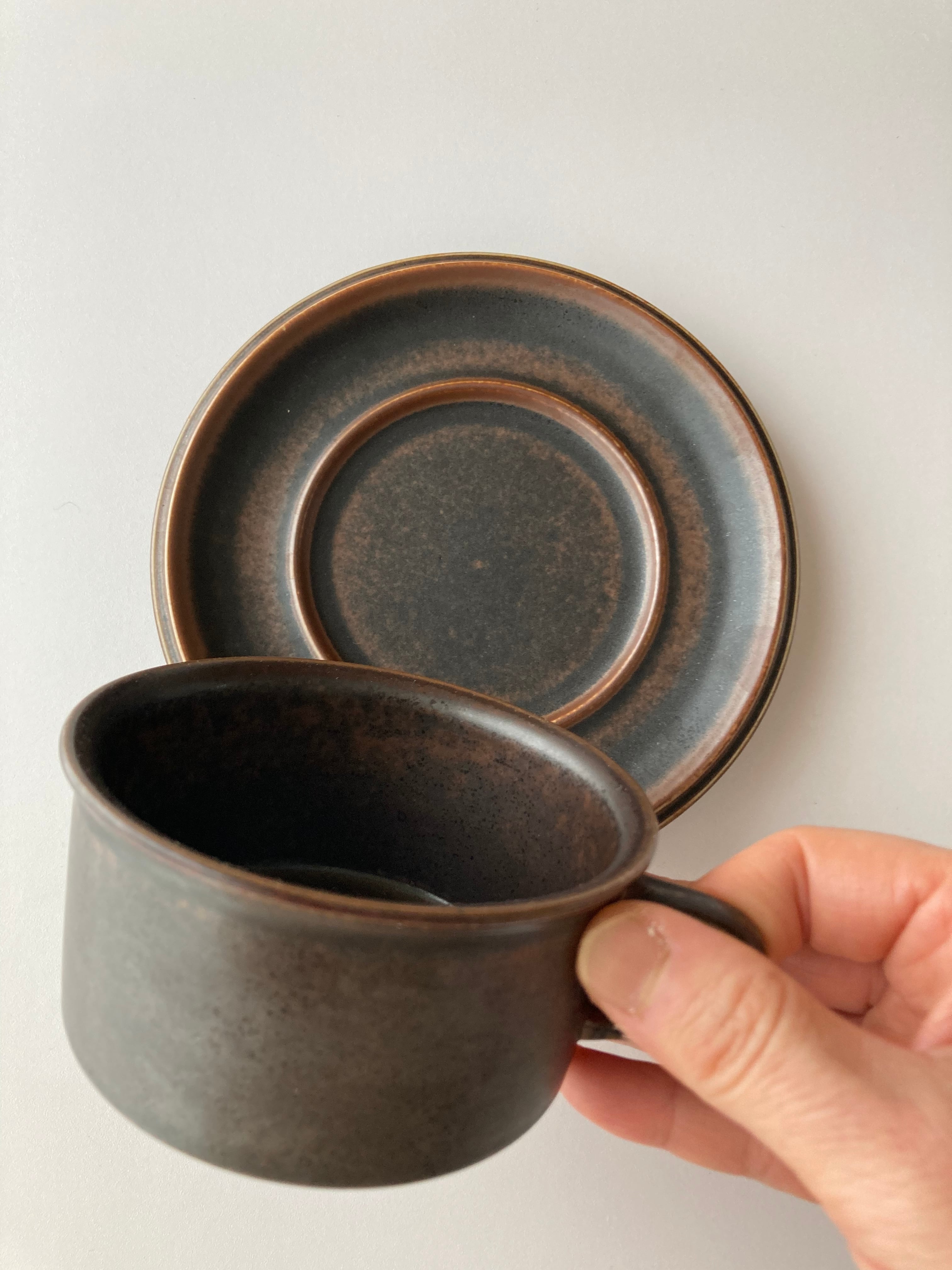 1961〜1999年製造販売。デザインしたのは数々の名作を生み出した、Ulla Procope(ウラプロコッペ)。その名前にふさわしく色づく紅葉のように深いブラウンの釉薬が特徴です。ひとつひとつ色の出方が違います。