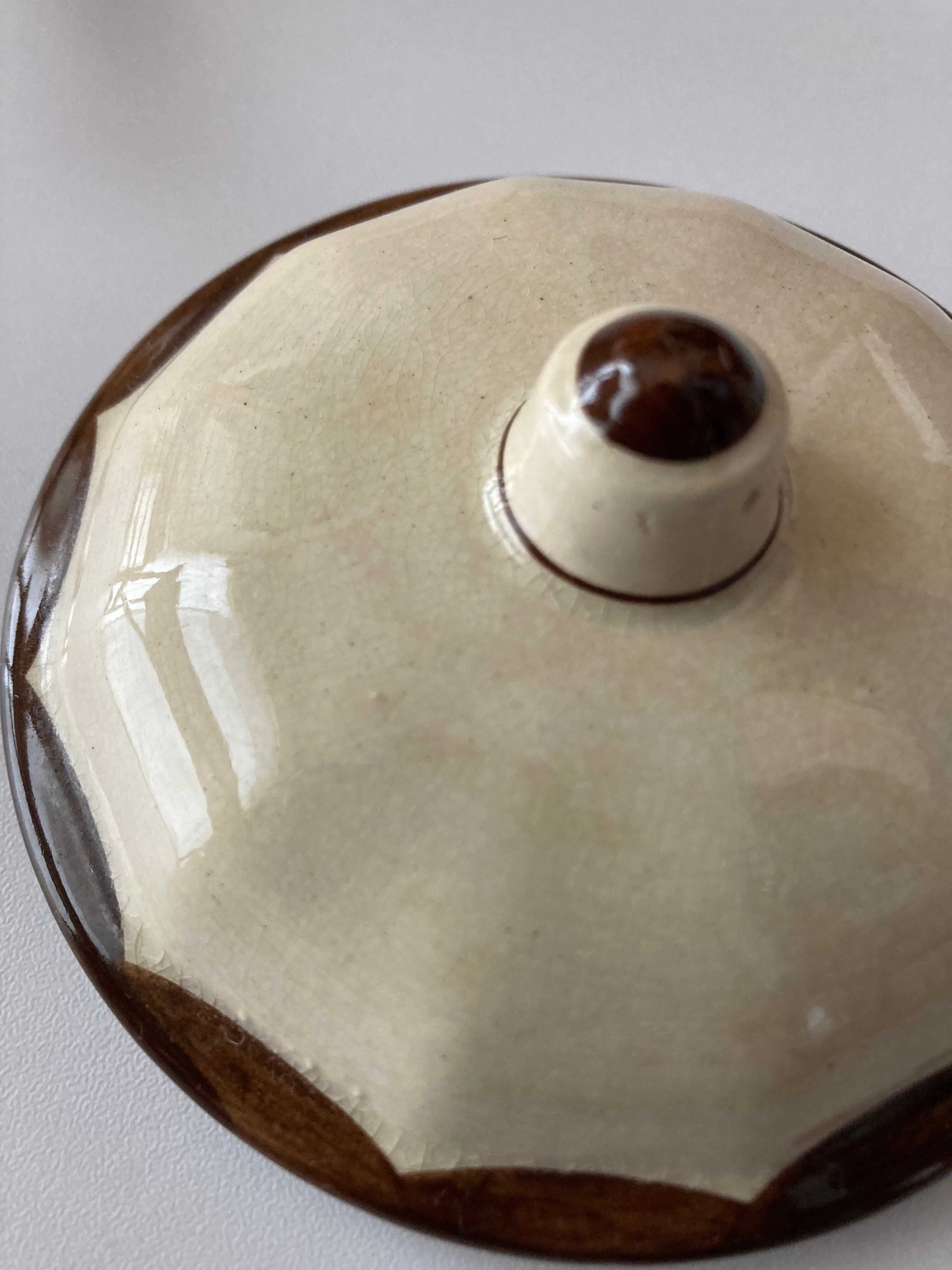 蓋の内側に小さなチップが二ヶ所見受けられますがそれほど目立つ物ではないかと思います。貫入も見られますが全体的に大変綺麗で美しいものになります。