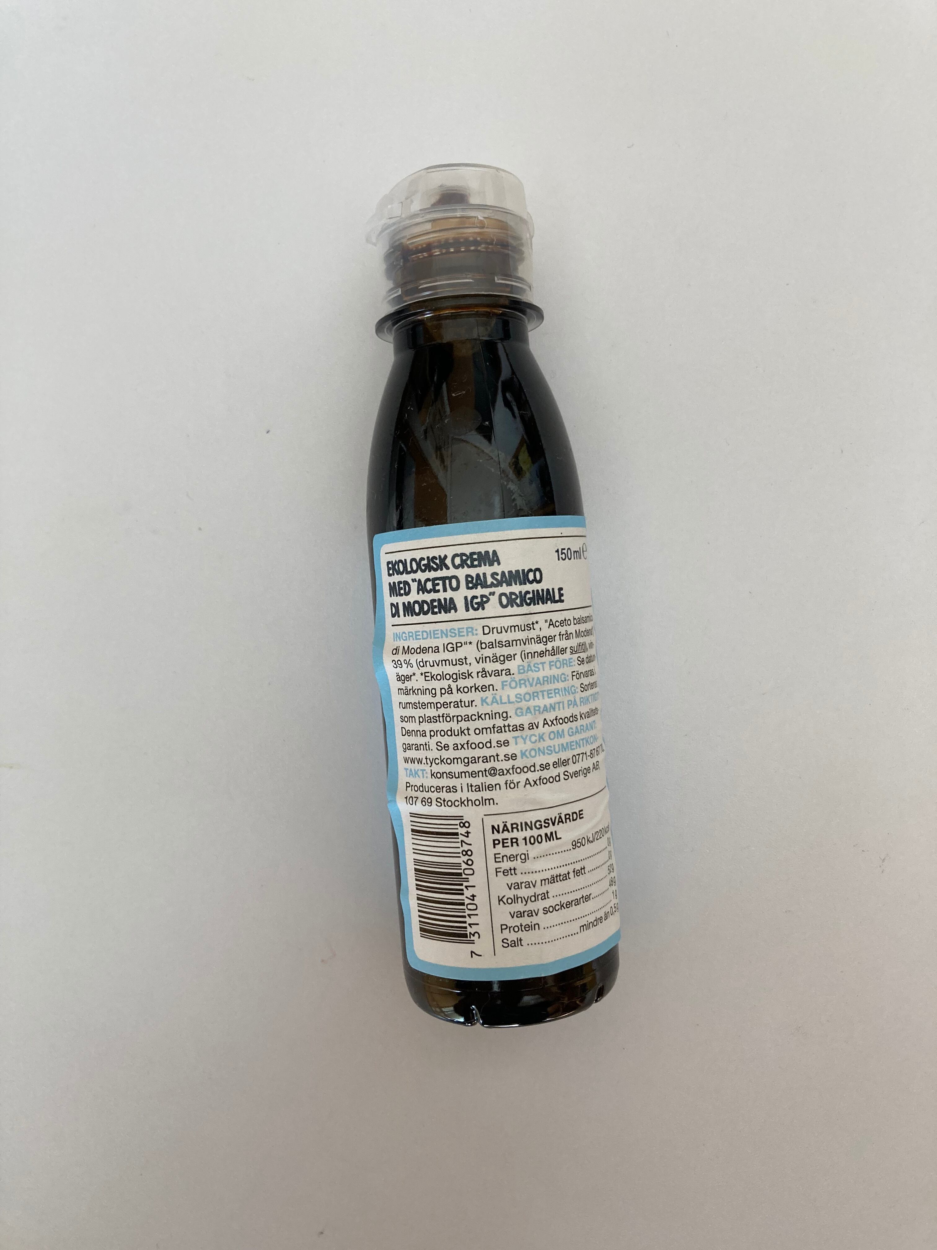 「モデナ産のクリーミーな味わいの有機バルサミコ酢。新鮮なサラダと甘いデザートの両方に適した古典的な風味増強剤です。有機ブドウ果汁と酢から作られています。Aceto Balsamico di Modena という名前はモデナとレッジョ エミリア産のバルサミコ酢であることを保証することを意味します。 Garant のエコラベルは、製品がオーガニックであることを示しています。」