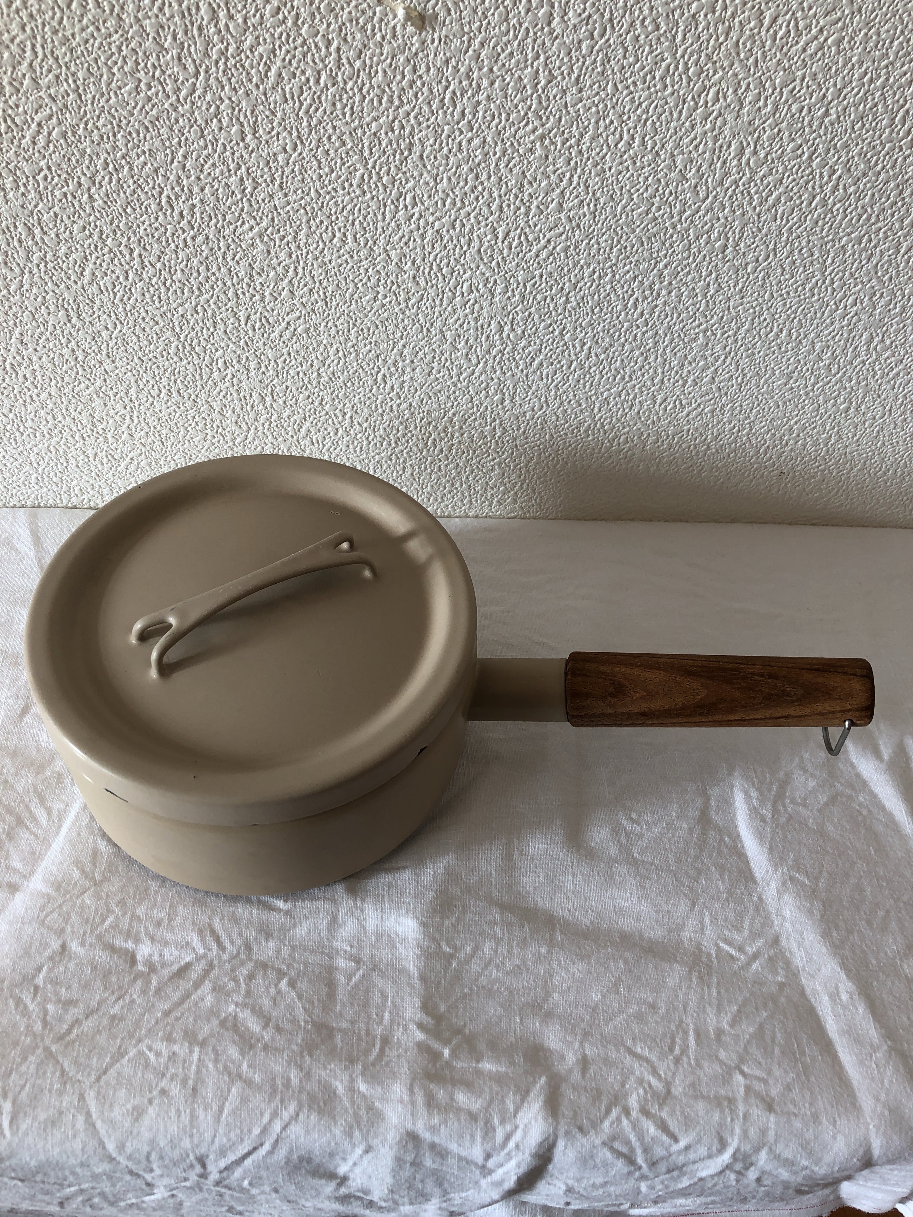 FINEL社製、Seppo Mallatデザインのホーロー片手鍋です。シンプルで落ち着いたベージュ色の片手鍋です。ホーローは保温性もよいのでスープや煮物などじっくりと火を通す料理にも向いています。